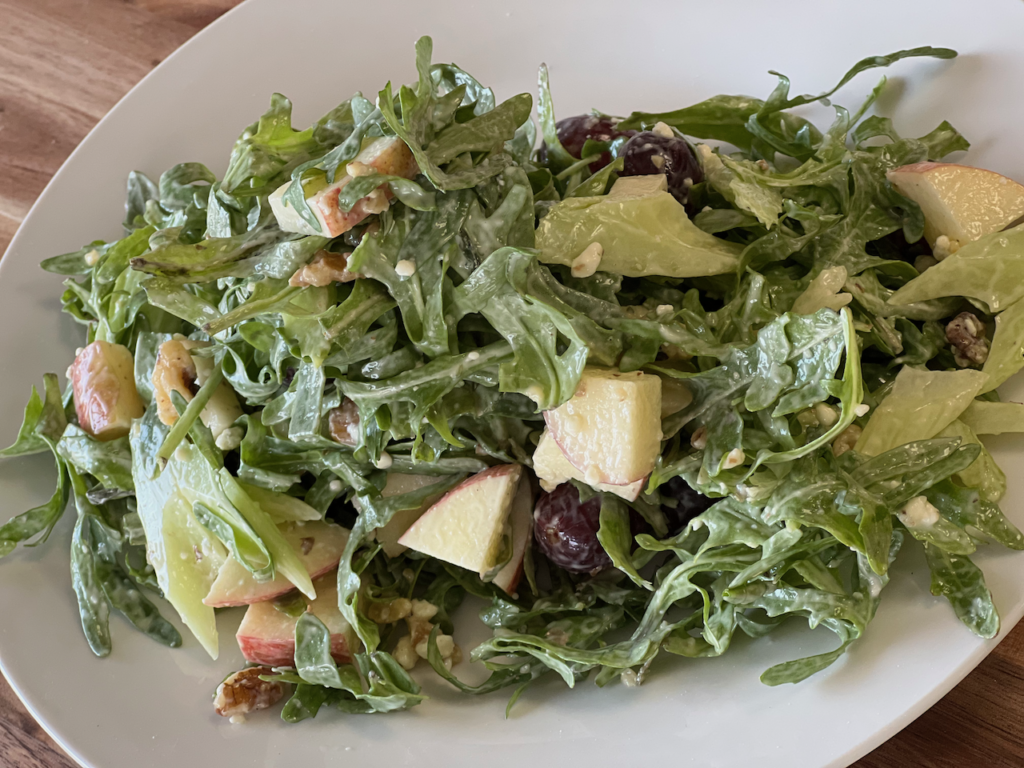 Roots Wood Fire Waldorf Salad includes: Apple, Grapes, Celery, Arugula, Walnuts, Creamy Apple Vinaigrette, Gorgonzola Cheese -