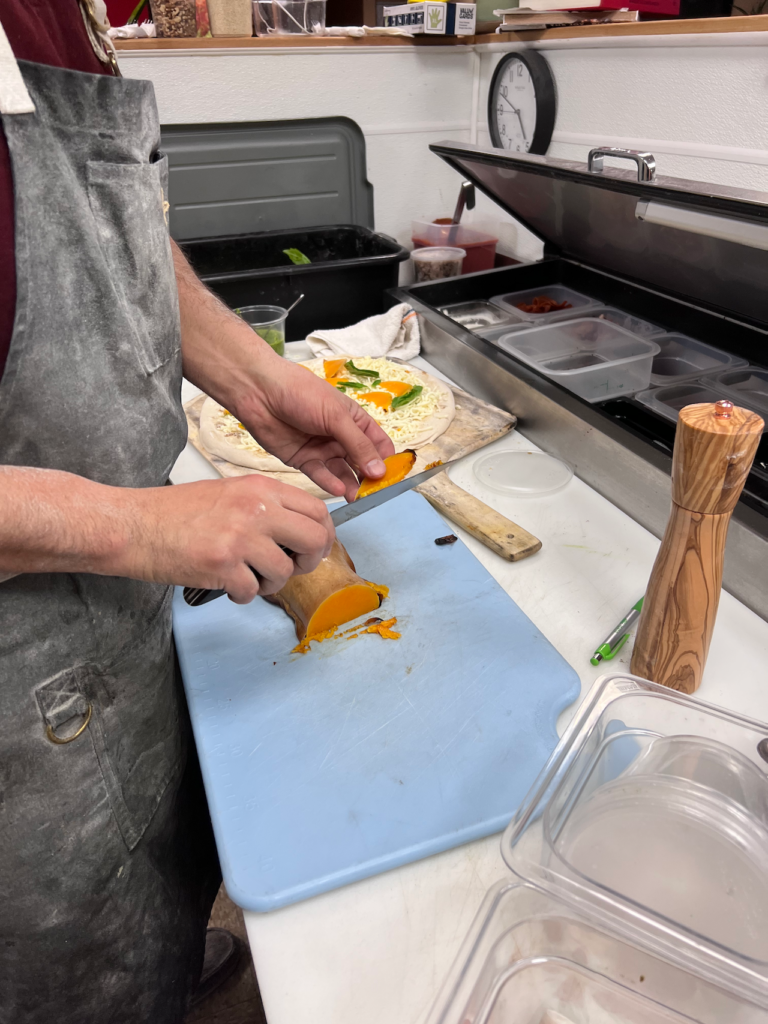 Seasonal Coachella Valley Date & Bacon made with our house made sour-dough pizza crust topped with Whole Milk Mozzerella, Red Onion, Walnut, Gorgonzola Cheese, Caramelized Onion Cream Sauce