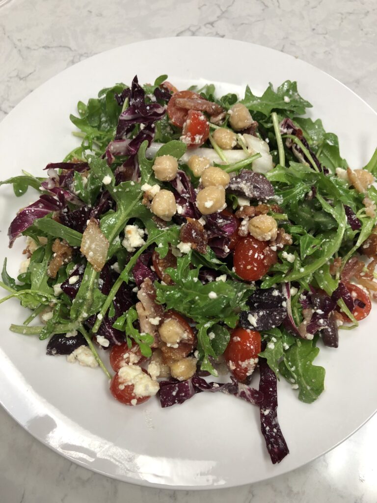 Our Staple Chopper Salad includes: Greens, Cherry Tomato, Chickpeas, Bacon, Olives, Arugula, Feta Cheese, Radicchio, Red Wine Vinaigrette -