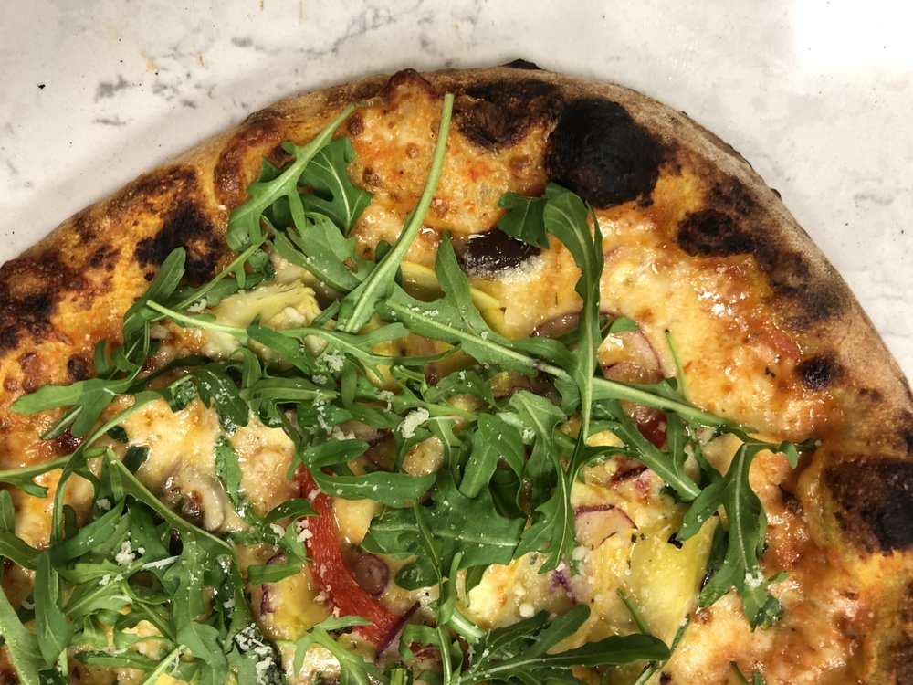 A True Veggie Delight begins with our Signature Dough & Sauce, then we add Whole Milk Mozzarella, Parmesan, Roasted Red Peppers, Red Onion, Artichoke Hearts, Feta Cheese, and finish it all off with fresh Arugula