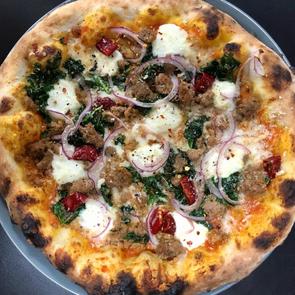 Made with our house made sour dough topped with Whole Milk Mozzarella, House Tomato Sauce, Pork Sausage, Kale, Red Onion & Ricotta Cheese.