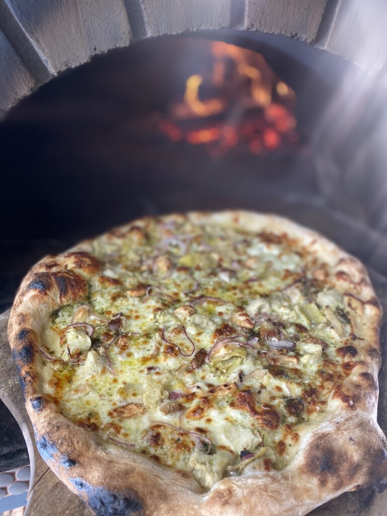 Made with our house made sour dough topped with Whole Milk Mozzarella, Parmesan, Artichoke, Roasted Garlic, Red Onion, Smoked Chicken & our Signature Kale, Basil & Walnut Pesto.