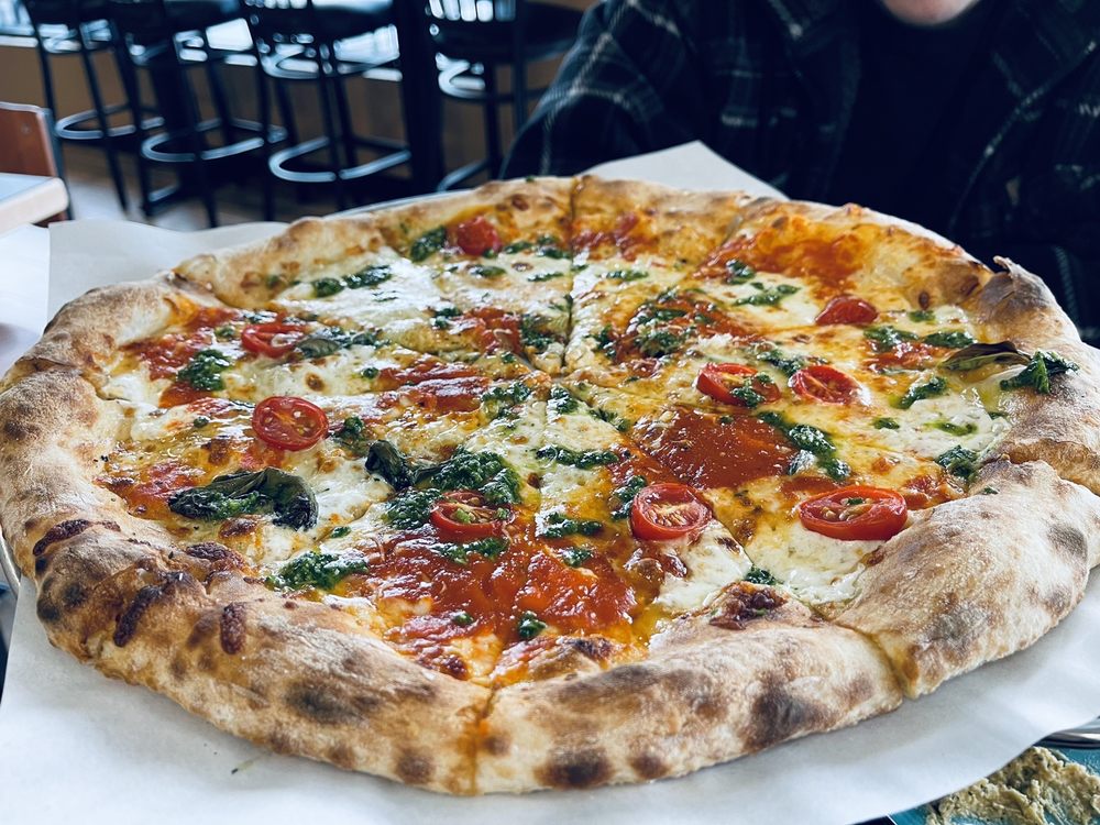 Classic Neapolitan Mergherita Chef William Style. Starting with our 34 Year Old Sourdough we Pile on our Fresh Mozzarella, Fire Roasted Tomatoes, and add our House Made Kale, Basil & Walnut Pesto. Truly a Delight $13.75/$25 Add Boars Head Pepperoni to make it a Margaroni Pizza for an add'l$2.50/$3.50